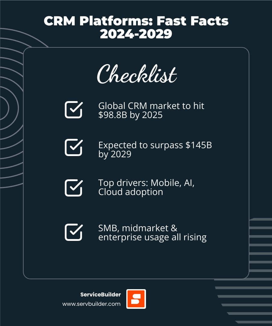CRM platforms are booming. The global CRM software market is expected to reach $98.84 billion by 2025 and surpass $145 billion by 2029, fueled by mobile, AI, and cloud technology.